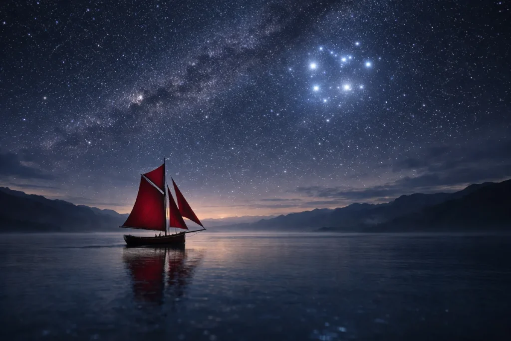 Here is the image inspired by the concept of Matariki, featuring a traditional sailing boat under a starry sky with illuminated clouds on the horizon